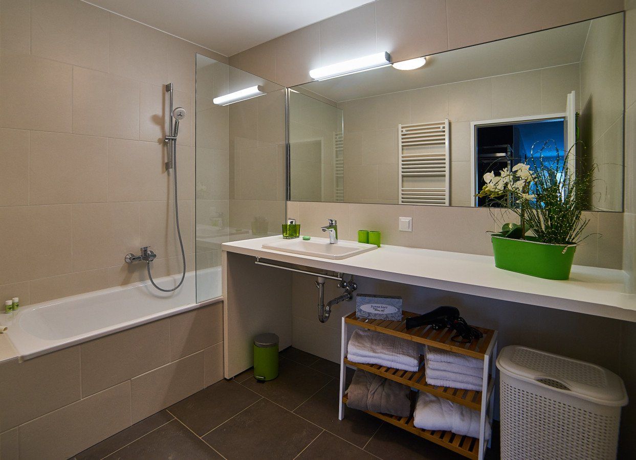 - Badezimmer mit Badewanne, Fön und Handtuchtrockner